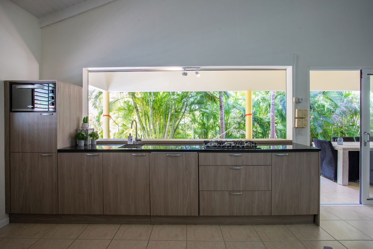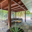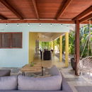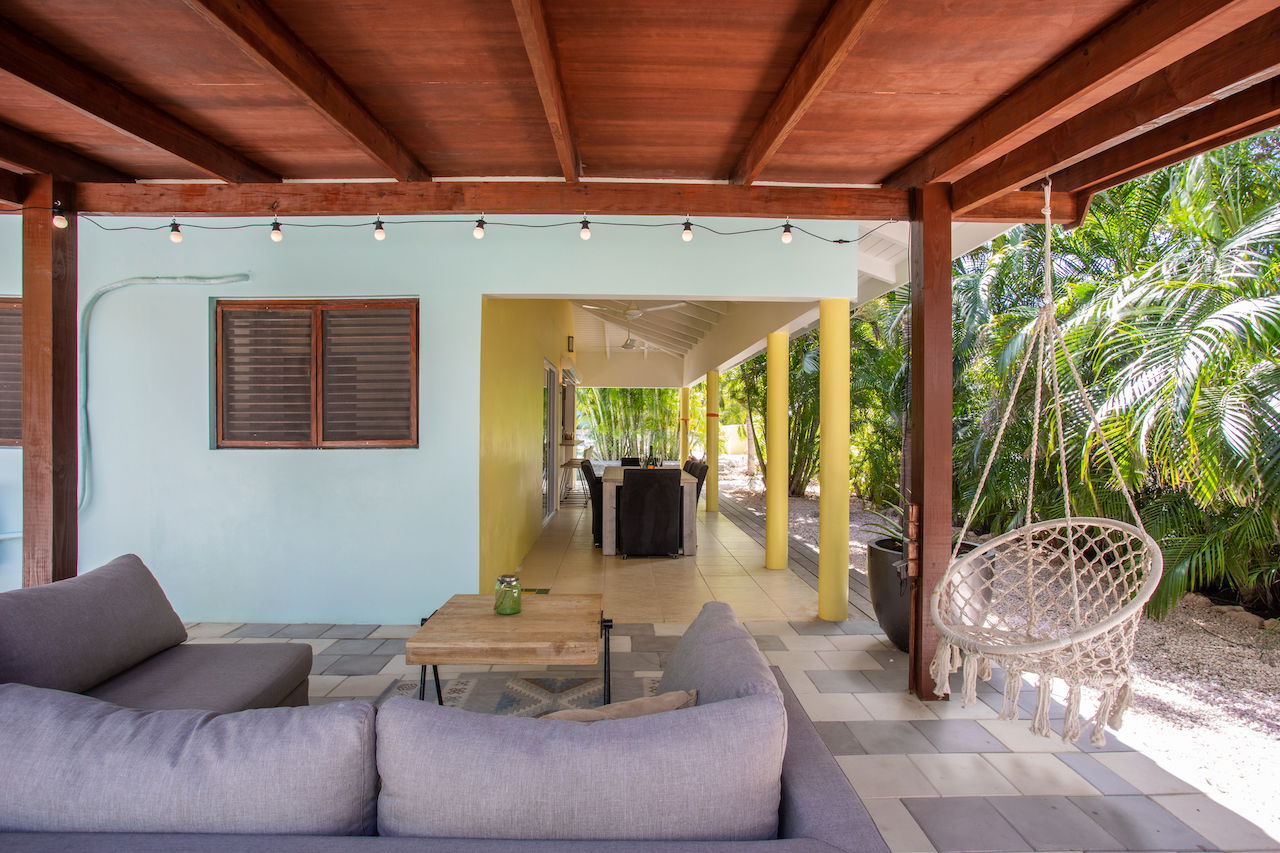 De woning ligt achter op het perceel, aan een doodlopende weg, kent veel privacy en een tropische tuin.